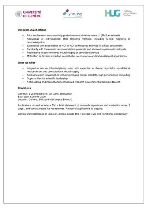 We are hiring a Postdoctoral Researcher in Connectivity-Guided Brain Stimulation at the Neuroimaging & Translational Psychiatry Lab (Synapsy Centre for Neuroscience and Mental Health Research, University of Geneva).